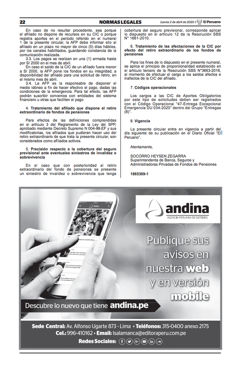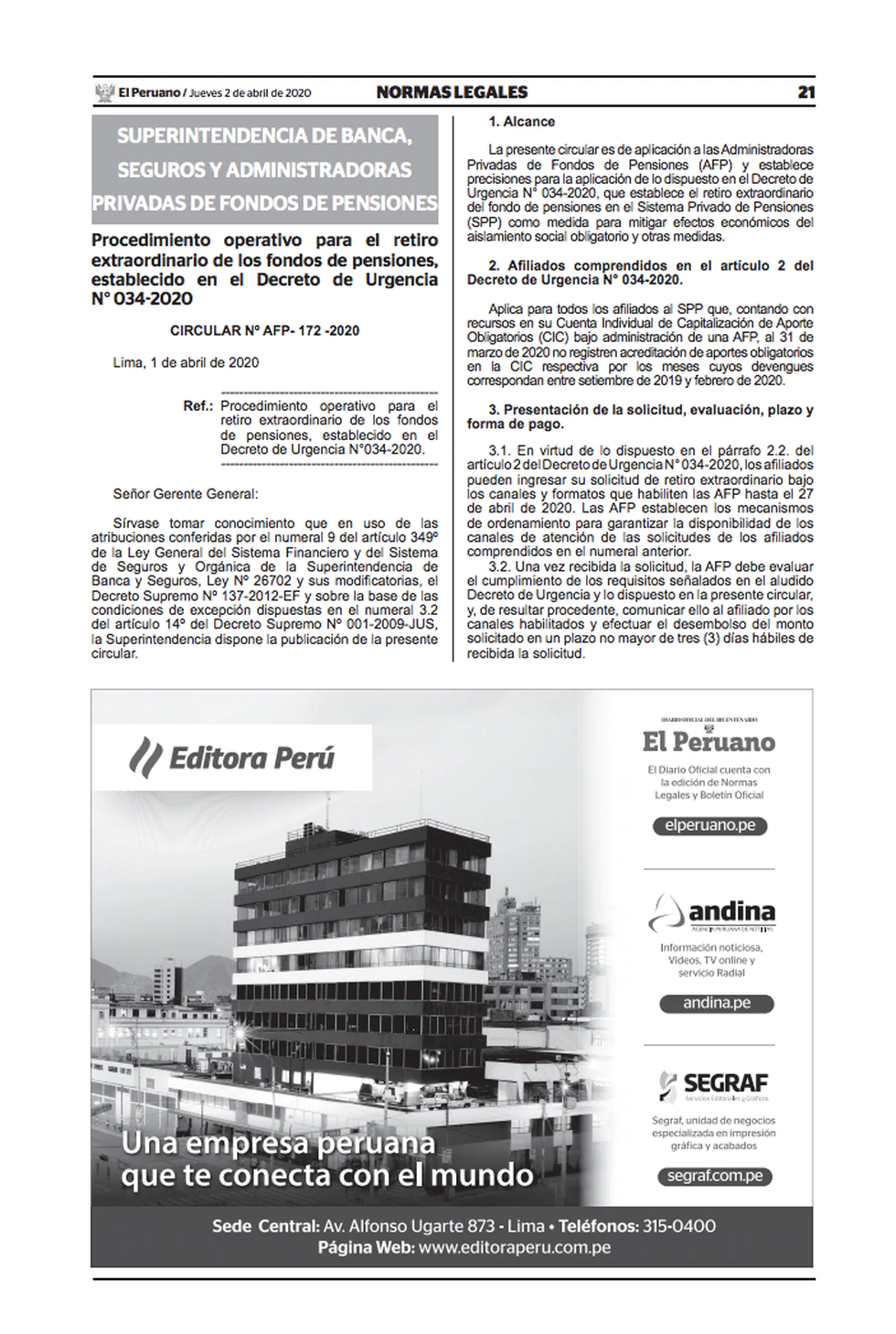 A través de El Peruano, la Superintendencia de Banca, Seguros y administradoras privadas de fondos de pensiones, explicó el procedimiento operativo para el retiro extraordinario de los fondos de pensiones (AFP), establecido en el Decreto de Urgencia N° 034-2020. El retiro del dinero entra en vigencia a partir de mañana viernes 03 de abril.